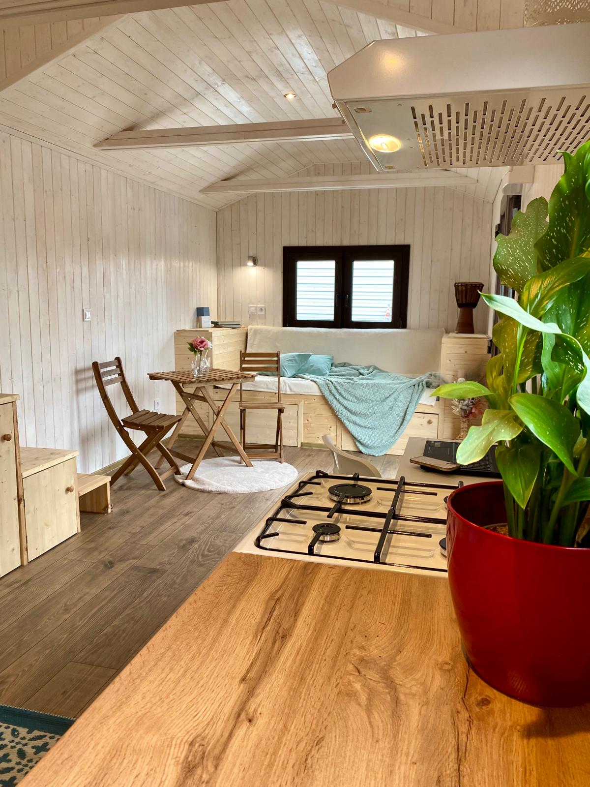 Tato dřevostavba na kolečkách vás překvapí prostorným a chytře navrženým interiérem, ve kterém nic nechybí. Základem je obývací pokoj s kuchyňským koutem, kde nechybí ani plynový vařič, trouba a lednice značky BEKO v režii nového majitele - na přání je možnost postavit kuchyň se zabudovanými spotřebiči. Kuchyň je tak připravená na každodenní vaření i víkendové pohoštění přátel. Součástí obytného prostoru je také vestavěná lavice s úložným prostorem, která kombinuje pohodlí i praktičnost.